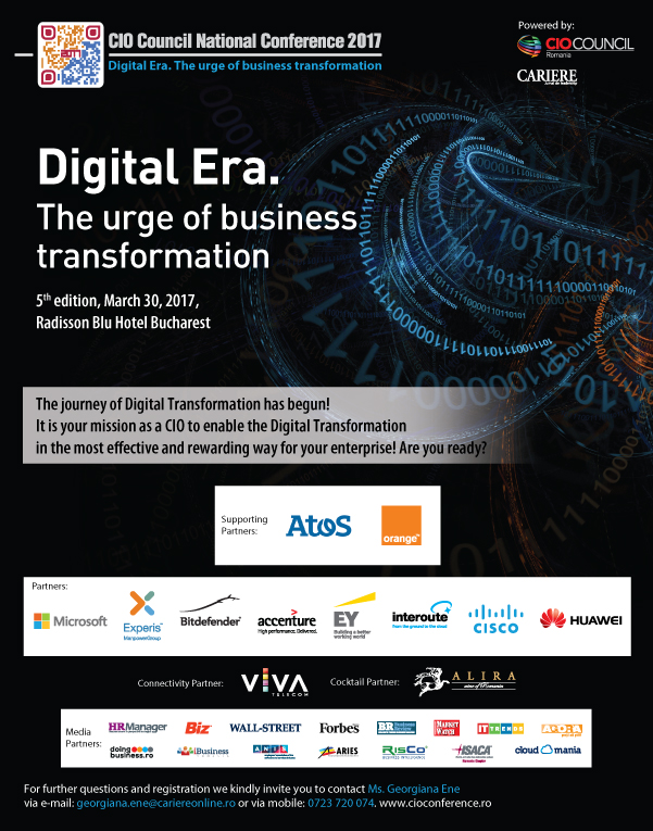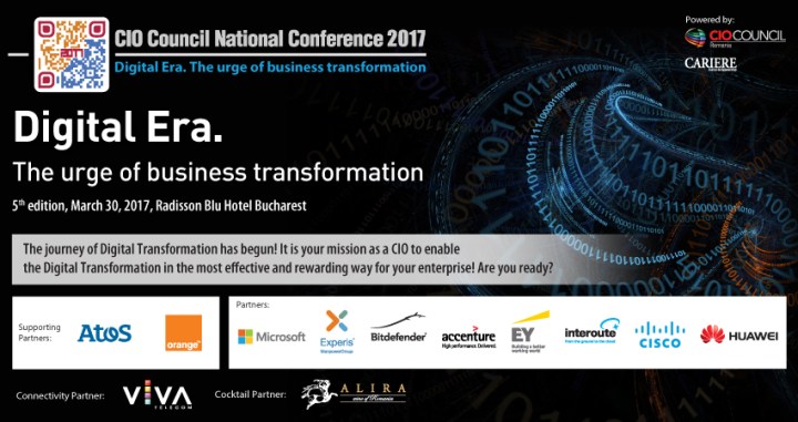 În acest context, este normal ca anul acesta Conferința națională a managerilor de IT din România să se focalizeze pe noua misiune a managerilor IT de a facilita transformarea digitală într-un mod cât mai eficient și mai benefic pentru companie. Ediția a V-a a conferinței anuale organizată de CIO Council România și revista Cariere are ca generic: „Digital Era. The urge of business transformation” – A început aventura transformării digitale!” și va avea loc pe 30 martie 2017 la Hotel Radisson Blu din Bucureşti, sala Atlas. Evenimentul va reuni peste 250 de profesionişti şi manageri IT, CIOs şi COOs, oferindu-le acestora o excelentă ocazie de a discuta despre top 3 preocupări majore ale specialiştilor IT: Alinierea (în top în ultimii patru ani), Securitatea (în creştere în ultimii doi ani) şi lipsa de competențe tehnice în Analytics, dezvoltare de software, securitatea informatică și domeniul Cloud.