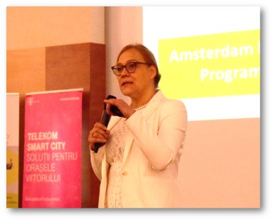 Principala prezentare a panelului a fost susținută de Manon Jutte, corporate strategist la Alliander NV, Olanda care s-a referit la studiul de caz al digitalizării orașului Amsterdam și la importanța pe care o au comunitățile locale în identificarea problemelor și generarea soluțiilor inteligente. Conceptul de bază care a servit la dezvoltarea digitală a orașului Amsterdam este focalizarea pe Democracy by Design. Încă de acum câțiva ani, primăria orașului Amsterdam a avut inițiativa înființării unui Smart Citizens Lab, instituție public-privată unde cele mai importante aspecte ale vieții civice sunt propuse și coordonate chiar de cetățeni. Împreună cu arhitecți, peisagiști, cercetători, locuitorii din Amsterdam participă direct la proiecte de purificare a aerului și a apei, limitare a zgomotului și reducerea poluării prin intermediul unor inițiative dedicate precum: cele mai bune canale pentru înot, cele mai pure trasee de parcurgere a orașului, sau care este cel mai liniștit cartier.