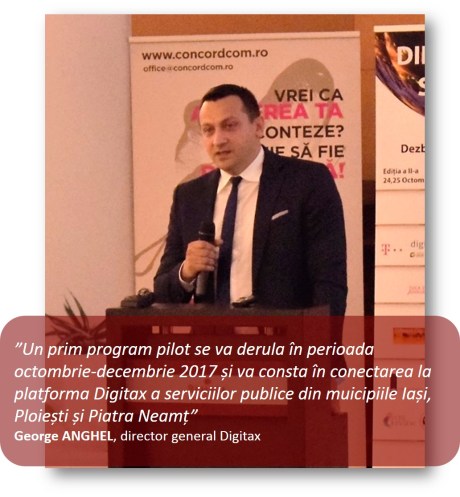 George Anghel, director general al Digitax a abordat problemele ridicate de transformarea digitală, precum și o noutate de ultim moment care rezolvă una dintre principalele probleme existente în administrarea publică: lipsa de interconectivitate între diferitele sisteme informatice, construite pe diferite platforme, în diferite stadii tehnologice. Bazată pe aplicații ce rulează în Cloud, platforma Digitax se bazează pe o interfață de front-end precum Ghiseul.ro, care permite tuturor instituțiilor publice dintr-o municipalitate să acționeze într-un mod ușor, rapid și interconectat.