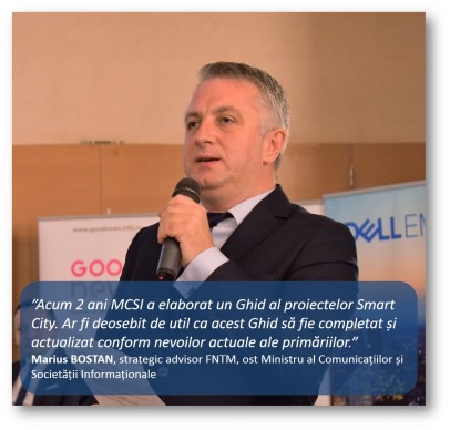 „E timpul ca un public cât mai larg să afle că orașele pot fi inteligente sau ar trebui să fie. Primarii, manageri municipali, ar trebui să fie informați despre soluțiile existente care îi vor duce în rândul orașelor inteligente. Există și în România orașe care au intrat serios pe acest trend și care sunt exemplu de știut, de urmat. Apoi, cetățenii fiind informați, vor ști ce să ceară edililor și cum să participe și ei la acest efort. În acest mod vor putea grăbi adoptarea soluțiilor pentru Smart City”, a declarat Marius Bostan. ”Acum 2 ani în cadrul MCSI a fost elaborat un Ghidul Smart City pentru România. Ar fi deosebit de util ca acest Ghid să fie completat și actualizat conform nevoilor actuale ale primăriilor.”