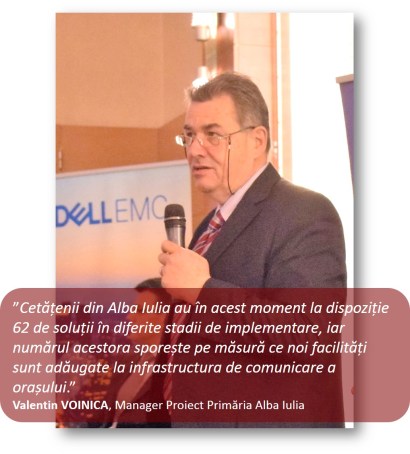 Moderatorul acestei secțiuni a fost Valentin Voinica, Manager Proiect la Primăria Alba Iulia, care a prezentat succint stadiul actual de dezvoltare al celui mai amplu proiect al municipal de tip Smart City al momentului. Cetățenii din Alba Iulia au în acest moment la dispoziție 62 de soluții în diferite stadii de implementare, iar numărul acestora sporește pe măsură ce noi facilități sunt adăugate la infrastructura de comunicare a orașului. Coloana vertebrală a sistemului Smart City este rețeaua de Internet în bandă largă, 4G/4G+, Wi-Fi și LoRaWAN. Rețeaua Wi-Fi include peste 228 puncte de acces în cetate și oraș și 15 puncte de acces în mijloace de transport în comun. Rețeaua dedicată obiectelor conectate la internet (IoT), LoRaWAN, acoperă prin 6 gateway-uri întregul oraș și conectează 150 de senzori de iluminat și apă. Această infrastructură deschisă are la bază o platformă open data prin intermediul căreia aplicațiile dezvoltate de start-up-urile partenere conectează autoritățile locale, localnicii, turiștii, precum și antreprenorii din Alba Iulia. În acest mod, infrastructura digitală a orașului facilitează noi oportunități, precum și o optimizare a resurselor locale. Se dorește ca anul viitor pe 1 decembrie, când vom aniversa cu toții 100 de Românie modernă, orașul digital Alba Iuia să dispună de peste 100 de soluții inteligente funcționale.